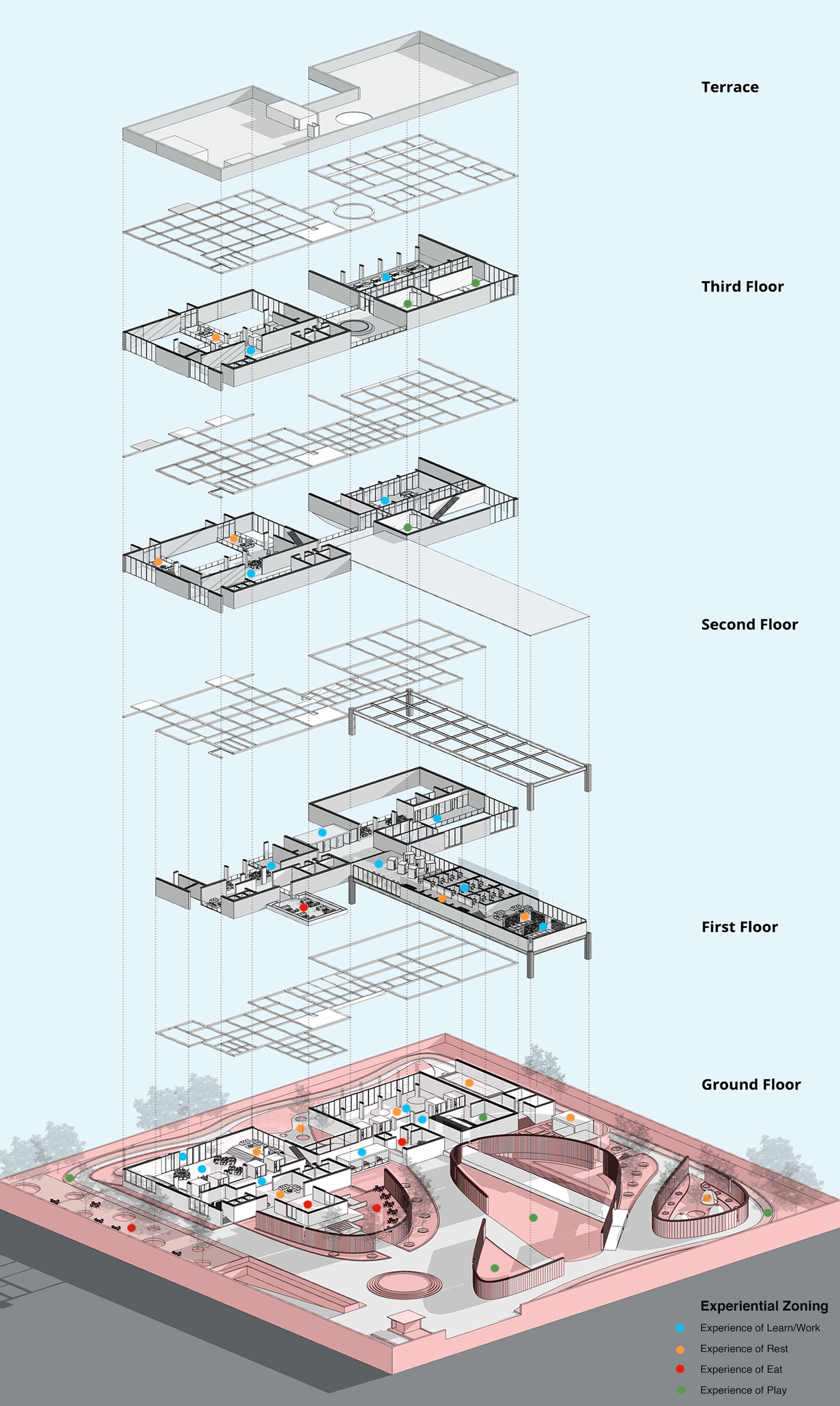 Vertical layering of experiences include: Learn |Work | Rest | Play