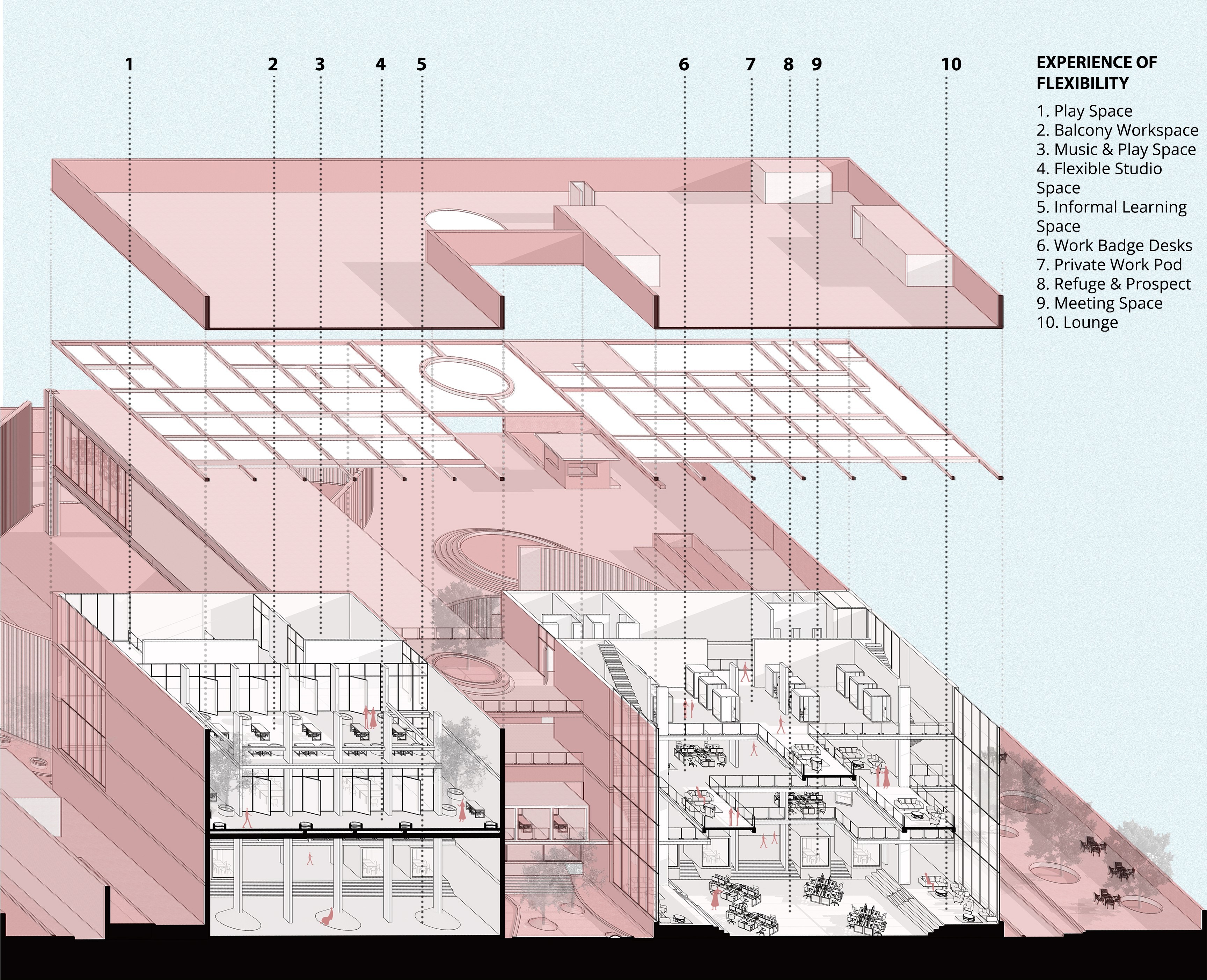 The future projects blurred binaries between working and learning environment. Office spaces are no longer restricted to a space where people are working just for the living. Employees need constant change in a workspace. Students are using any space which promotes collaboration, team learning, flexibility, transition between teaching modes and informal learning.