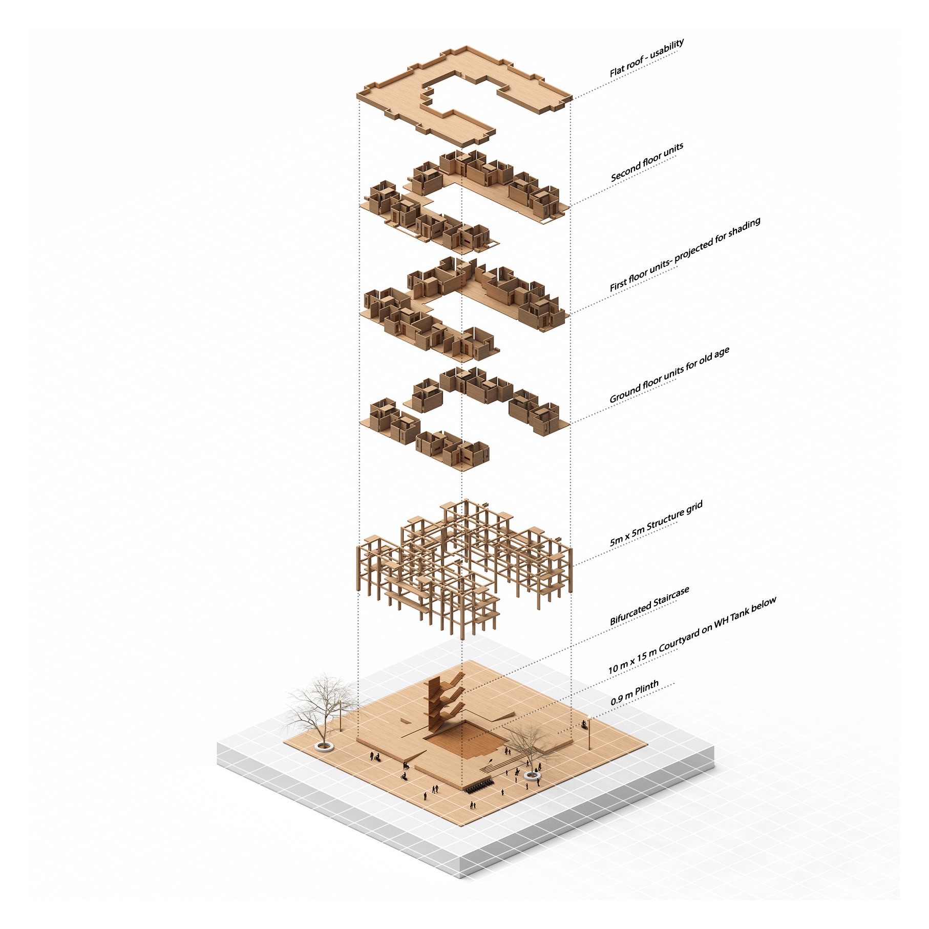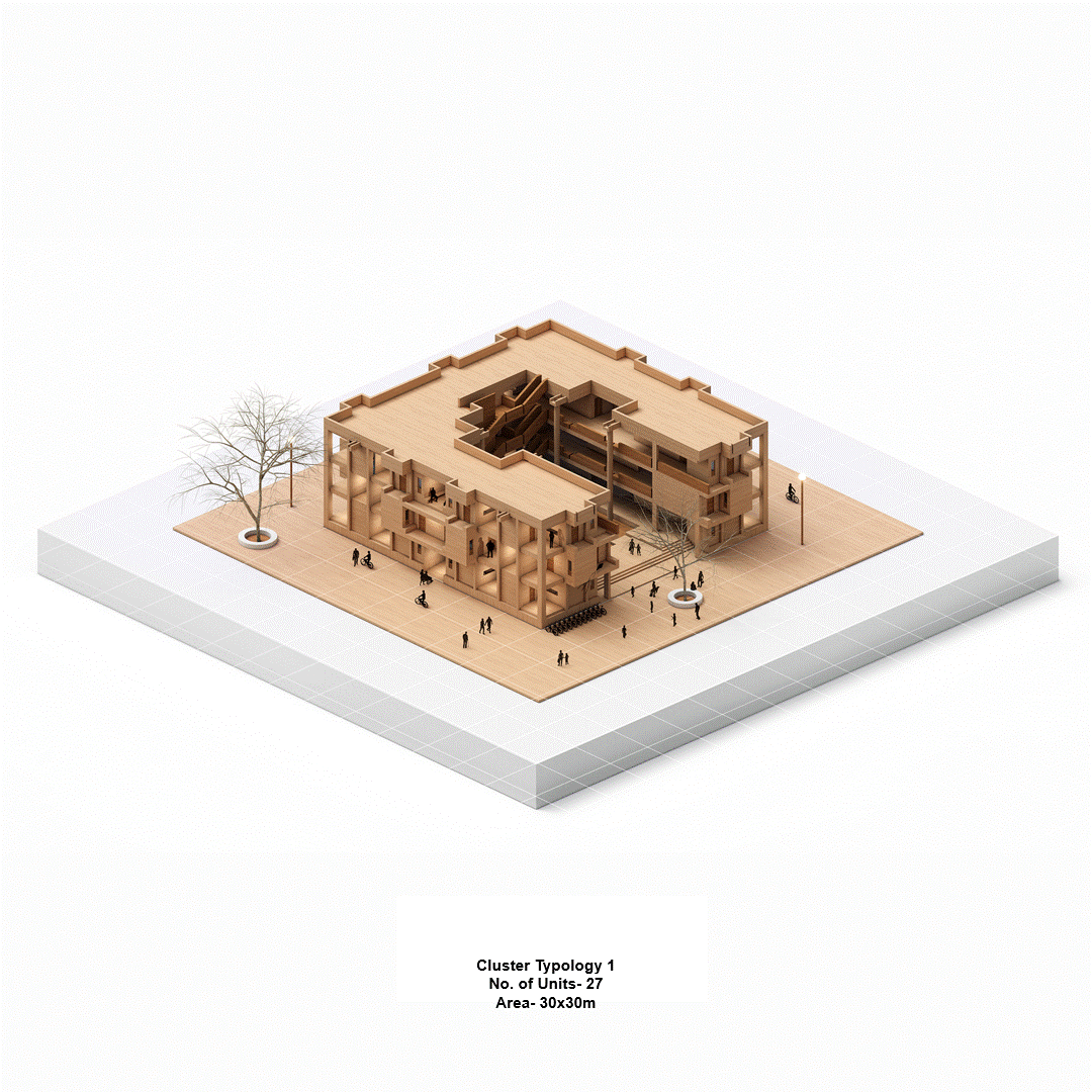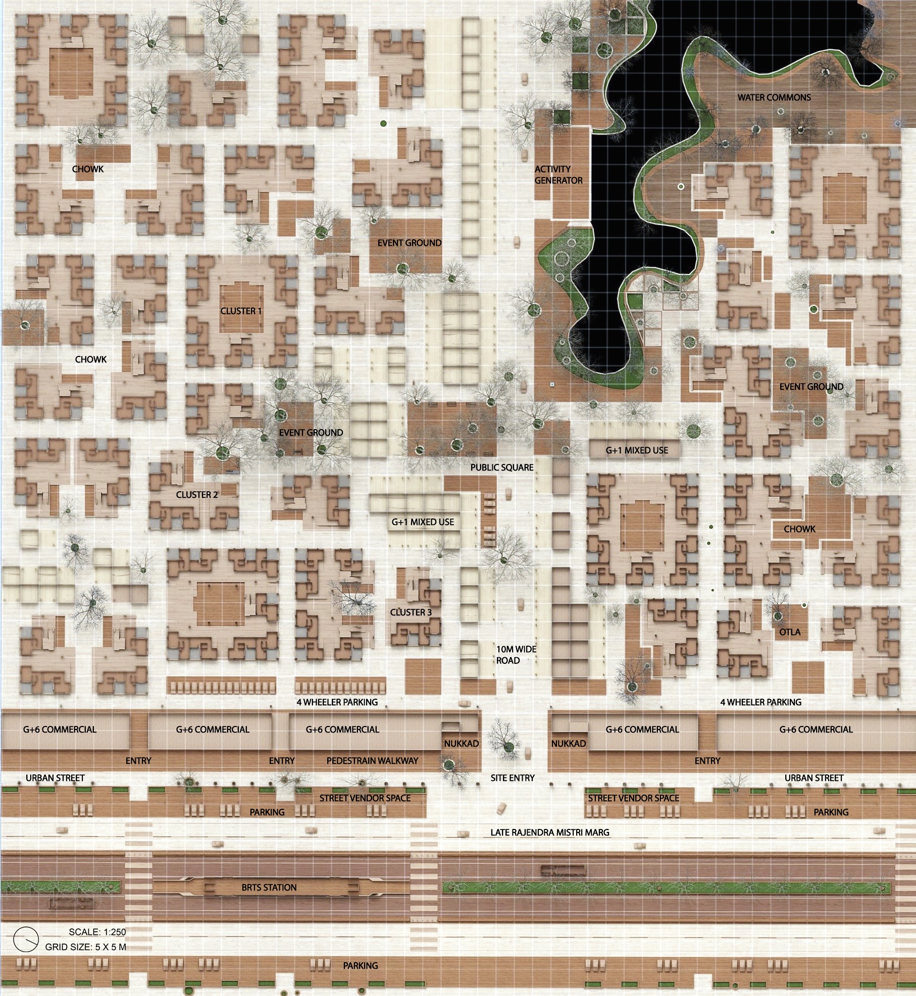 With nearly 25 million housing shortage, quantity takes precedence over quality in government policies and market responses. As Against, living environments are symbols of comfort and reverie. It’s a proud possession for the generations and symbol of comfort and family’s identity. Within the demands of density, can we conjure built-environments that are socio-culturally appropriate, sustainable and aesthetically timeless? This project is exploratory in nature to evolve humane and interactive neighbourhood with an understanding on integration of nature, interactivity, flexibility for personalisation and growth, humanising vertical living, reinterpreting the vernacular, etc. The idea is to integrate vernacular “Pol Housing” humaneness as the base of new typology for Slum re-development.