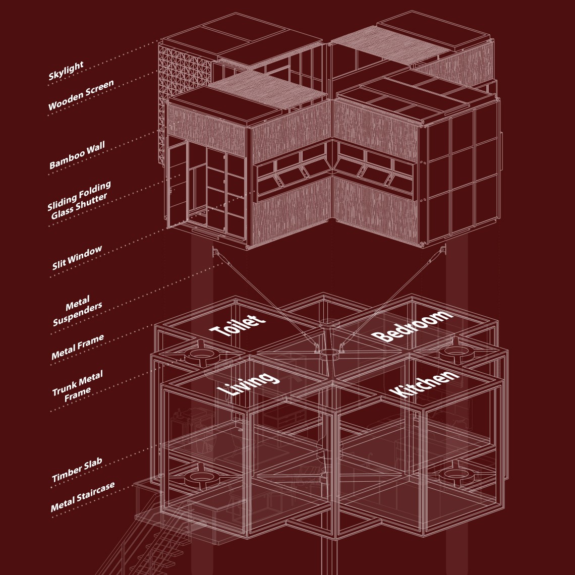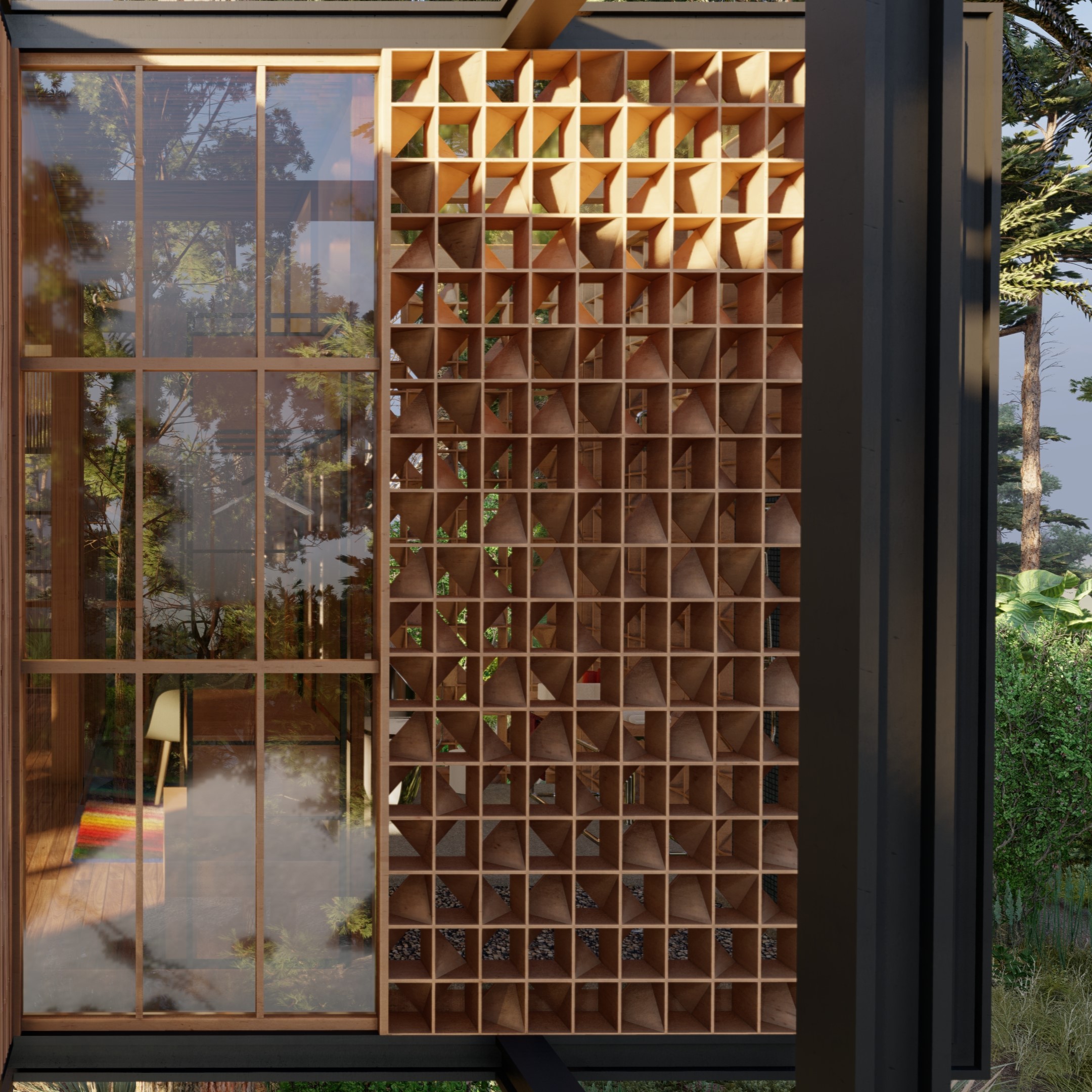 A sustainable, prefabricated system combining a metal frame and bamboo-wood palette ensures minimal site impact and maximum thermal responsiveness. Sliding glass shutters, skylights, and timber flooring enhance the biophilic experience, while modular clamp-based assembly protects trees, perfect for off-grid, forest retreats.
