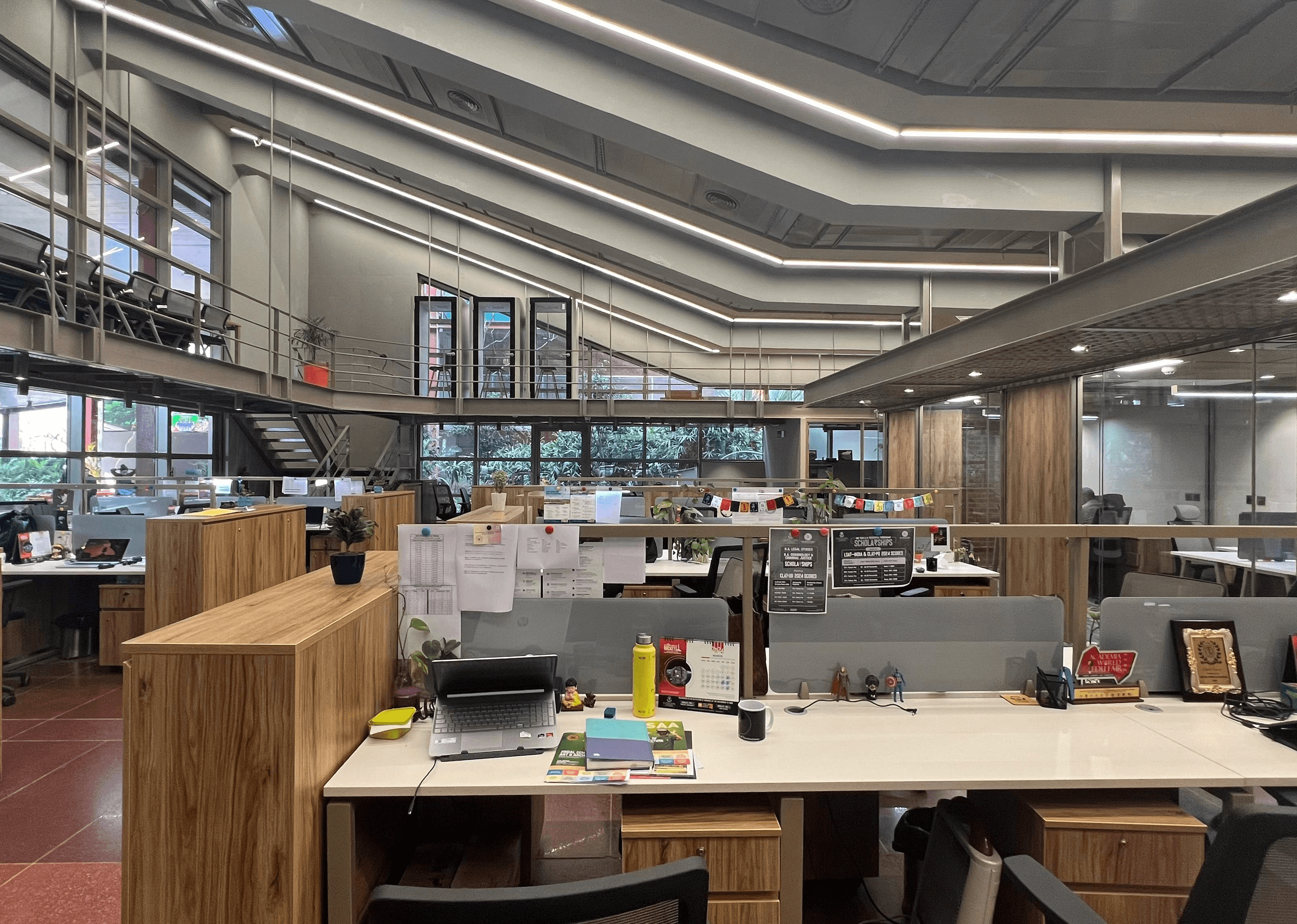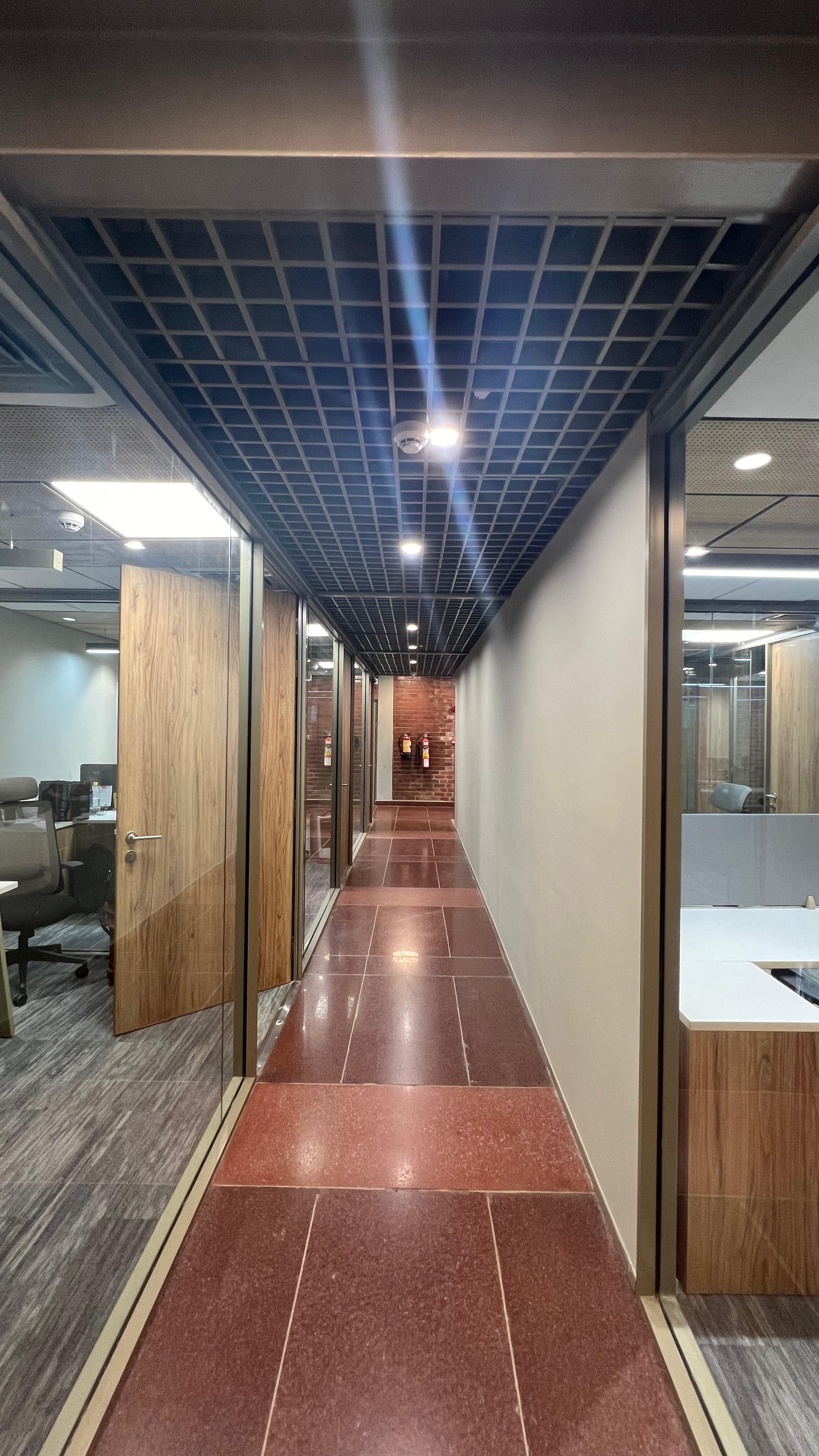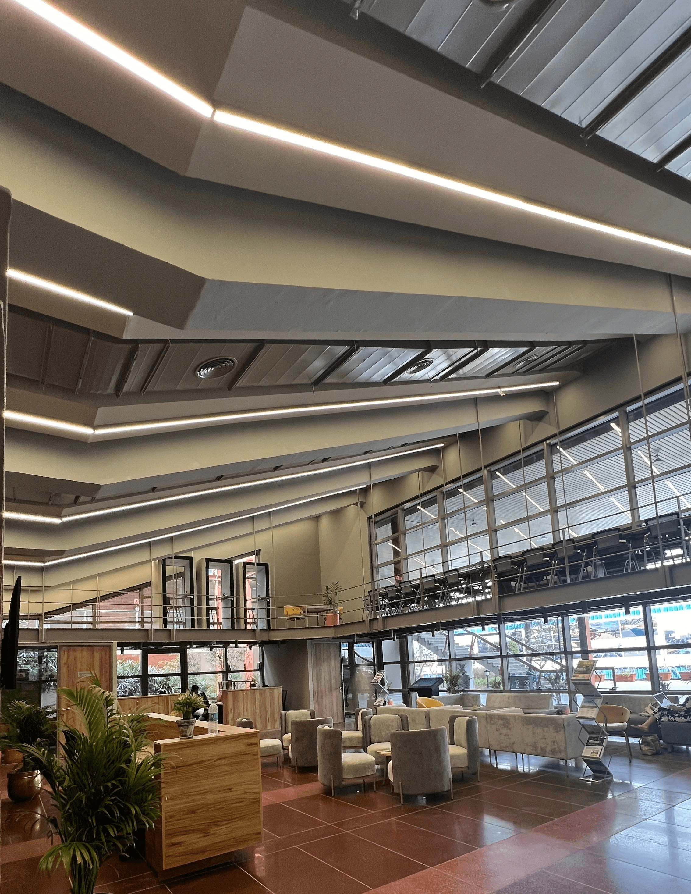 Once a dated canteen with heavy concrete beams and exposed services, the space has been transformed into a light-filled, two-level workspace that blends industrial character with contemporary comfort. We retained the original concrete frame and threaded a lightweight steel mezzanine around a double-height heart. Linear LEDs trace the beam rhythm; reorganized HVAC and acoustics sit within crisp bulkheads. Ground level hosts reception, Workdesks, Cabins, lounges and informal meeting pockets; above, Pods, and training desks. Warm brick, timber joinery and red-stone flooring balance the industrial shell. Prefabricated, low-demolition construction minimized waste, cost and downtime, delivering a flexible working environment.