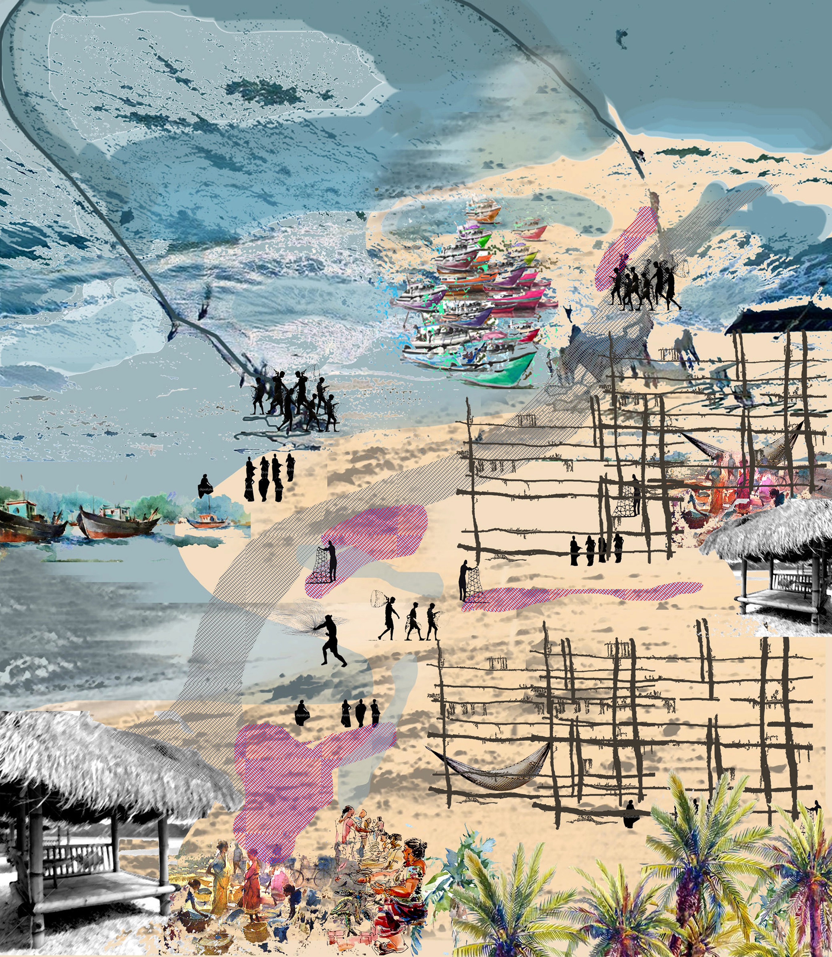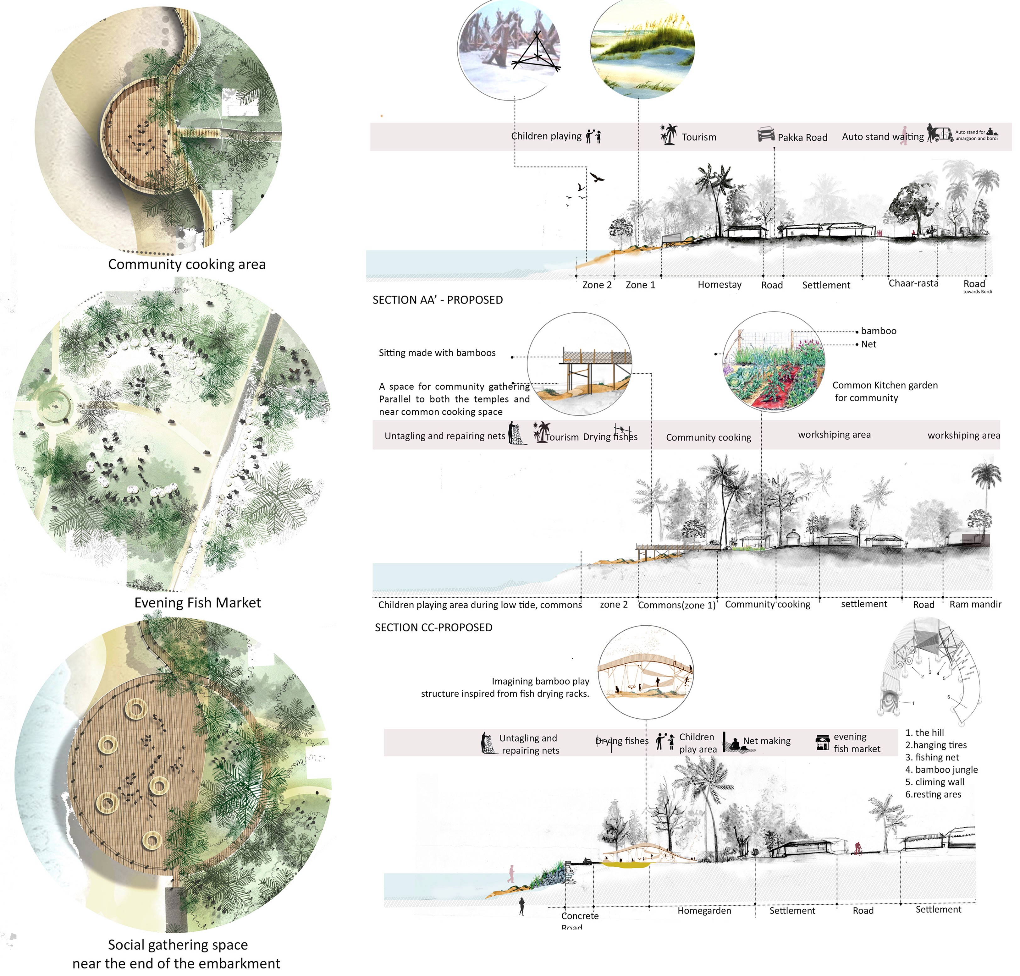 The Design carefully knots together the memories and their associated elements from culture and landscape to the existing coastal edge in a sensitive manner. It explores the native edge of dunes, beaches, and settlements as a series of small spatial inserts. These inserts range from a place for a community gathering near the existing community kitchen to small play structures inspired by fish drawing and net structures to a more natural edge to the sand dunes. It also re-shifts and places the fish market in its previous informal organization and character.