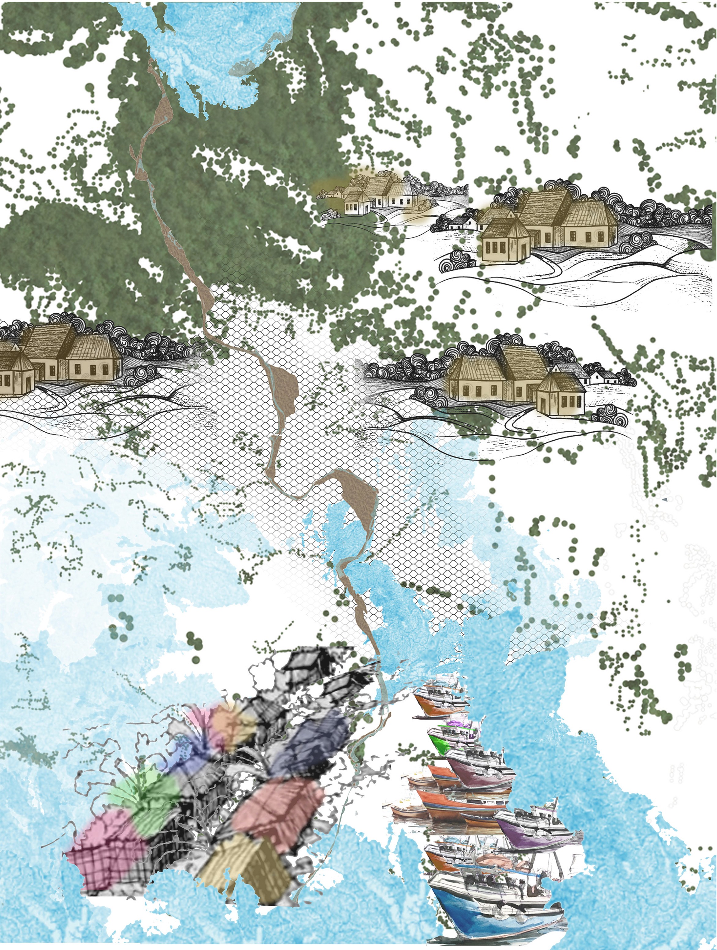 The project tends to acknowledge and re-activate the social spaces along the coast. Social spaces (knots) are designed by overlapping and comparing daily activities, mobility, common areas, and associated meanings of the fisherman’s community now and then.
